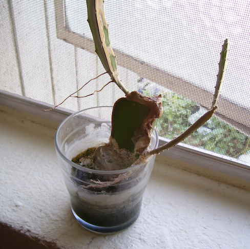 I remember how excited I was the first time it sent out a tiny new shoot. And I remember when I found it, lying in the dirt below its parent plant on the side of the road just west of Ajijic. I’d headed past the cemetery, walked until the road ran to dirt, kept going, all unplanned. I came to big fields with running horses, half-finished dwellings made of red brick. The sounds of the cars on the carretera were faint as I walked, and now and then I caught a glimpse of the lake two blocks south of me. In time I came upon the giant parent cactus, ten feet tall, sprawled behind a brick wall. I stopped on the road to study it. There was a tree in bloom beside it, big puffy cotton-like blossoms. I wanted to come back with my camera. I stood in the road for a long time taking it all in. I felt something ease in me. I hadn’t known how much I needed to get away, how much I’d craved open space, earth beneath my feet, solitude. I soaked up rural Mexico, released breath I didn’t know I was holding, gave thanks. And when I was ready to walk on, I found this little piece of cactus lying in the dirt beside the wall, and I carried it home with care.